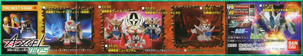 | 種類、詳細 | 定価96円(税別) 全6種 ●EX−19真英雄機スペリオル騎士ガンダム ●EX−20疾風騎士ブルーディスティニー(後期型) ●EX−21灼熱騎士F91 ●EX−22闘神武者ゴッドガンダム ●EX−23翔神武者ウイングガンダムゼロ ●EX−24剣神武者ニューガンダム □全高約7.8〜9.6cm □製品素材[彩色リアルフィギュア:ATBC-PVC] □2001年9月発売 |