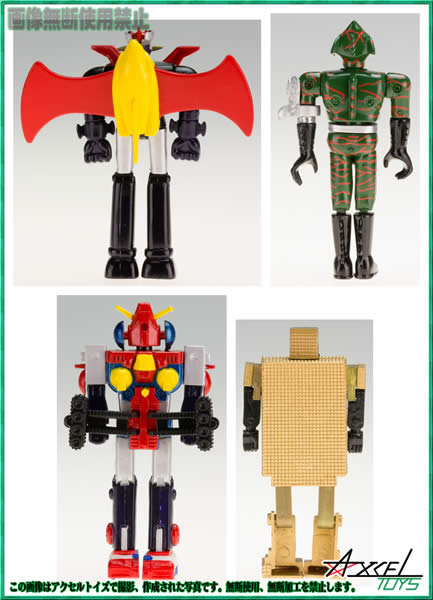 | 種類、詳細 | 定価286円(税別) 全4種 ●CGA−01 マジンガーZ ●CGA−02 アマゾンライダー ●CGA−03 超電磁コン・バトラーV ●CGA−04 黄金戦士ゴールドライタン □全高約6.9〜7.7cm □コン・バトラーVはグランダッシャー形態に変形できます。 □ゴールドライタンはライター形態に変形できます。 □箱(個別パッケージ)全高約5cm □製品素材[本体:ATBC-PVC,ABS,ダイキャスト] ※ダイキャストはマジンガーZとアマゾンライダーの脚部のみ。 □2002年8月発売 |