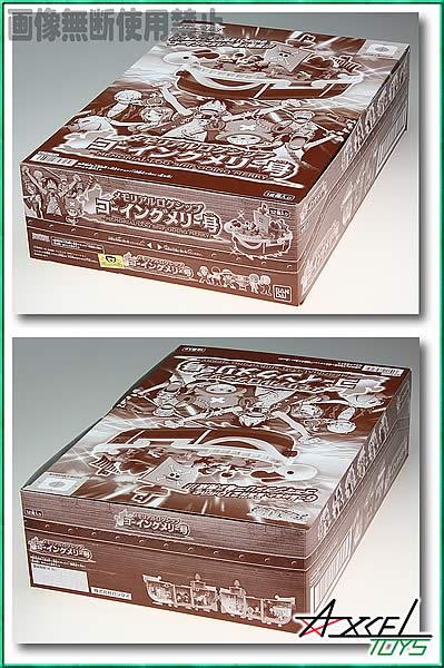 | 種類、詳細 | 定価380円(税別) 全6種 ●ルフィ vs エネル in スカイピア ●ゾロ vs ミホーク in 海上レストラン“バラティエ” ●ナミ & サンジ in ココヤシ村 ●チョッパー vs ワポル in ドラム王国 ●ウソップ & カルー in ウイスキーピーク ●ビビ vs クロコダイル in アルバーナ □全高約6.5〜10.2cm □キャラクターフィギュア全高約1.9〜2.7cm □ゴーイングメリー号全長約21cm,全高約15.2cm □製品素材[本体:ABS・PVC/人形:PVC] □2011年1月発売 |